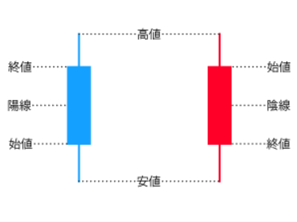 始値より終値の価格が高い場合を陽線、始値より終値の方が価格が低いときを陰線といいます。